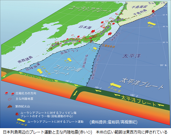 日本列島の本州は、約300万年前に始まった東西短縮地殻変動により、海底が隆起した結果、陸化して生まれたが、現在も東西方向に強く押される動きは変わっていない。こうした東西短縮地殻変動は、日本列島の各所に歪みをともない、地殻にそのエネルギー(歪みエネルギー)を蓄積。地殻の強度を超えると、地殻が破壊され、逆断層や横ずれ断層が動き、エネルギーが解放され、地震を引き起こしてきた。