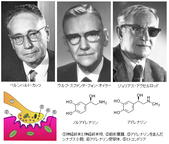 フォン・ユーレアは1946年にノルアドレナリンを発見した。さらにノルアドレナリンが神経細胞に蓄積されるとその神経細胞が臓器や組織の働きを支配することを示した。