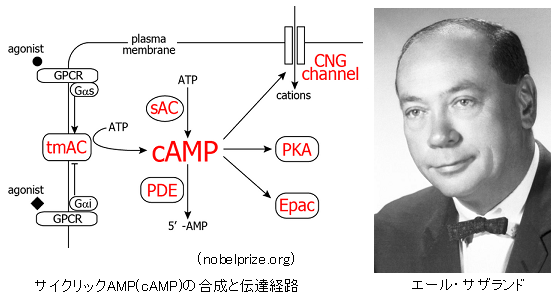 しかしサザランドによって、細胞内で情報伝達物質が受容体(レセプター)と結合することで作られる別の情報伝達物質が、細胞の代謝や変化に影響を与えることがわかった。