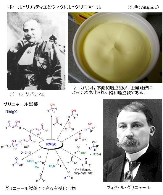 さて、1912年のノーベル化学賞は「有機化学」の分野で2人の受賞となった。一人はフランスの化学者ポール・サバティエと、もう一人は同じくフランスの化学者ヴィクトル・グリニャールである。サバティエの受賞理由は「微細な金属粒子を用いる有機化合物の水素化法の開発」グリニャールの受賞理由は「グリニャール試薬の発見」であった。それぞれの研究内容はどのようなものだろう?